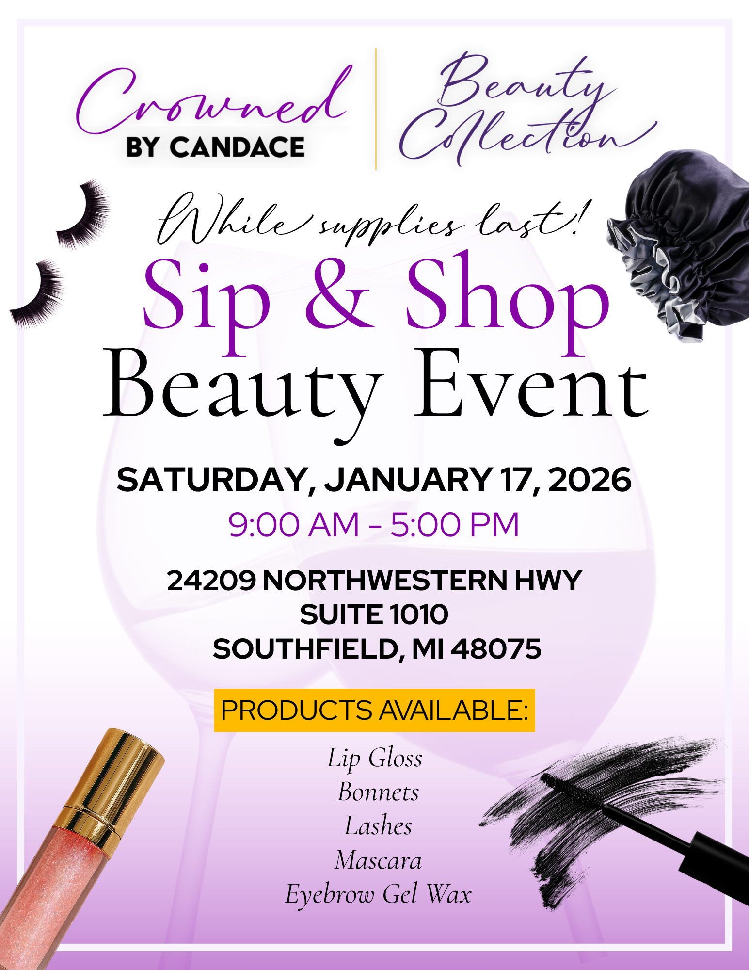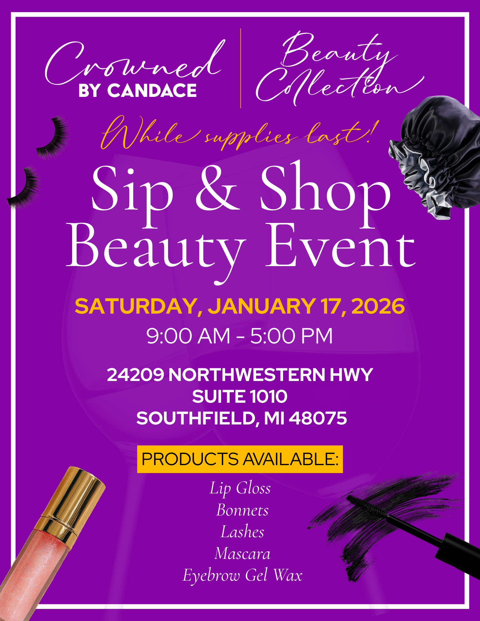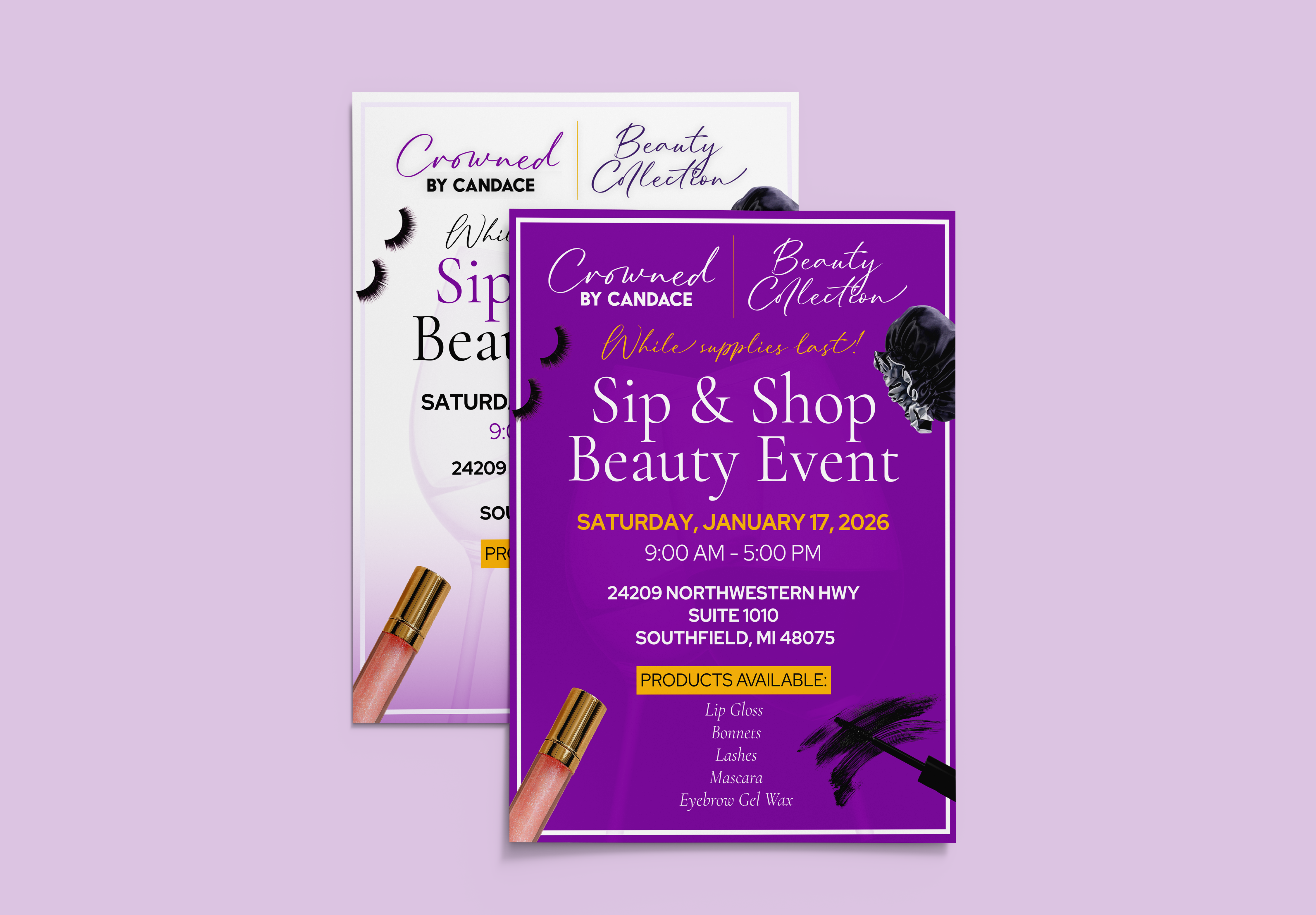 Flyer DesignCrowned by Candace is a beauty brand built around confidence, self-expression, and feeling elevated in everyday life. For the launch of her new beauty collection, Candace needed a strong visual campaign to promote her Sip & Shop Beauty Event and introduce her new product line to customers in a way that felt polished, modern, and retail-ready.