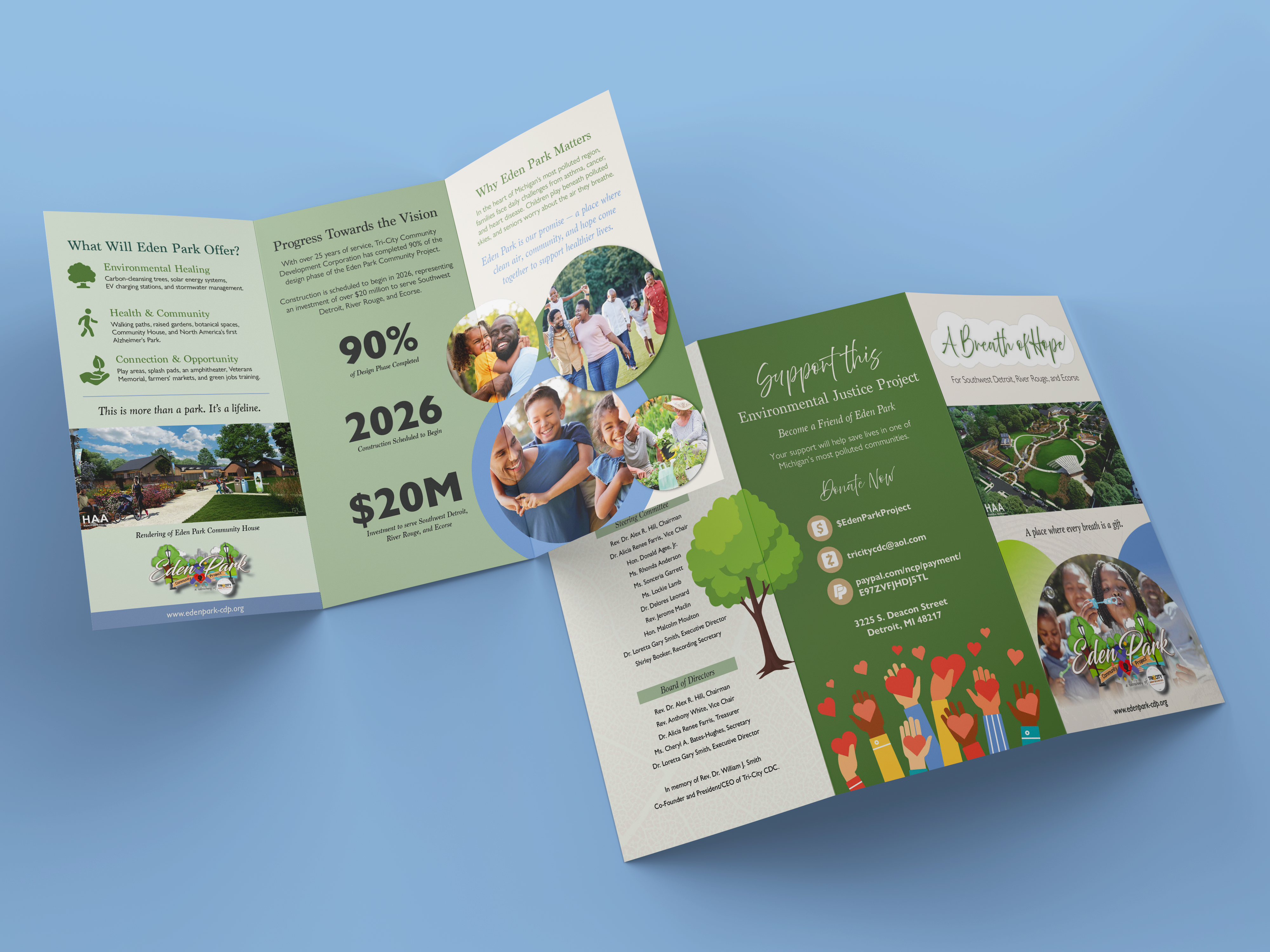 Flyer DesignThe Eden Park Community Project is an environmental justice initiative led by Tri-City Community Development Corporation, focused on transforming a former school site into a 5.7-acre green space for Southwest Detroit, River Rouge, and Ecorse. The goal of this project was to design a tri-fold brochure that clearly communicates Eden Park’s vision, progress, and community impact while inspiring trust, engagement, and donations.